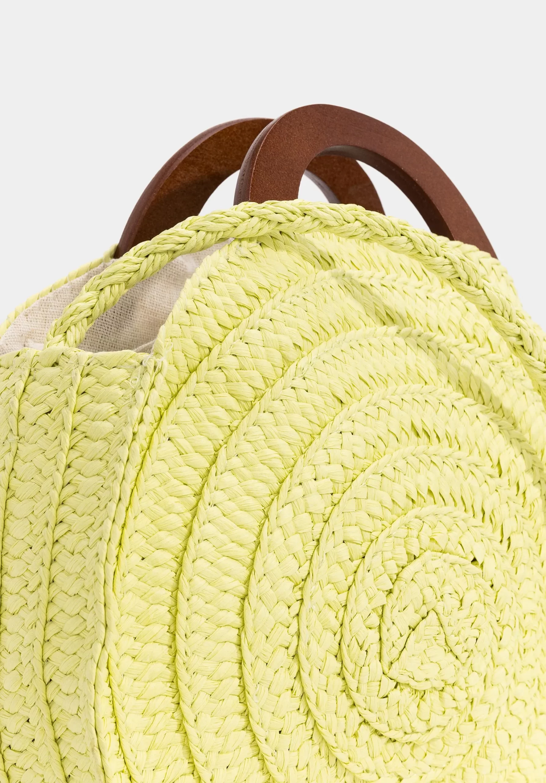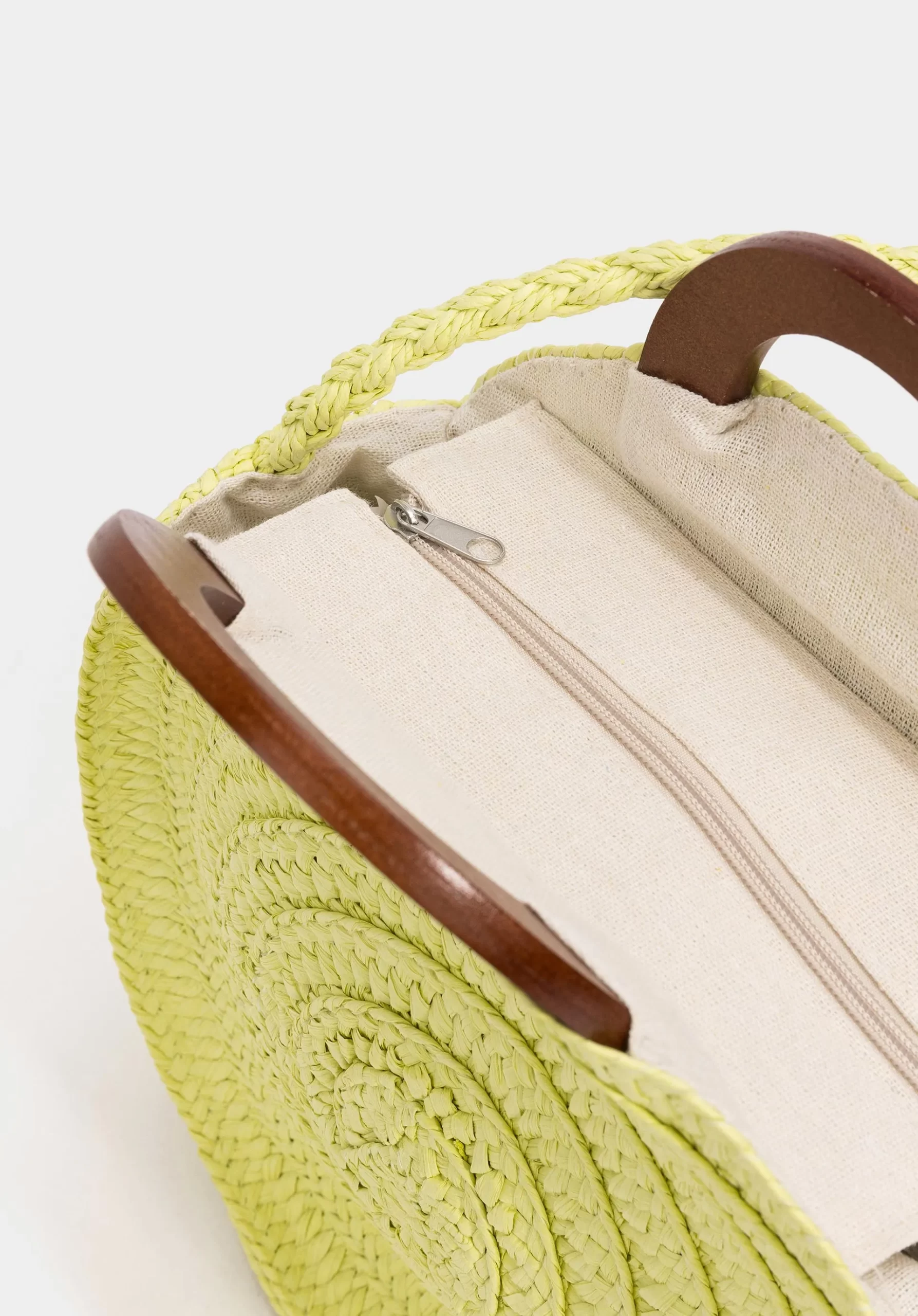 Handmade lime straw shoulder bag with wooden handles and top zip closure.